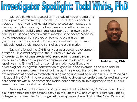 Dr. Shelia McClure and Dr. Todd E. White Dr. White was invited to present his research at the June 28th session of Morehouse School of Medicine's Scientific Seminar Series. Dr. White provided a report on what has been accomplished thus far in the development of a preclinical model of chronic repetitive mild traumatic brain injury in his laboratory. The presentation sparked a productive discussion about what can be done to improve the model and advance the research project.